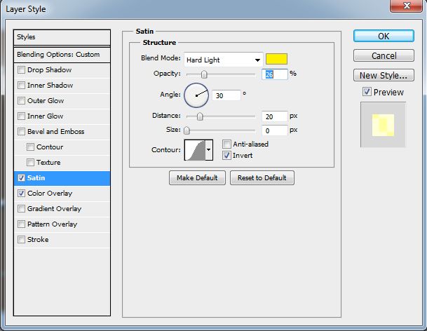 Selanjutnya kita akan menambahkan Layer Style pada layer "api" atur Satin & Color Overlay pada layer, atur seperti gambar berikut, klik untuk memperbesar.